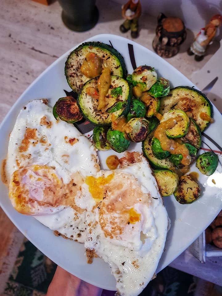 Oua ochiuri, câteva felii de zuchinni și căpățâni de varză de Bruxelles gratinate și condimentate bine, cu sos de pesto, maioneză light (Hellman) și dulceață de ardei iute (Arovit) – cate o linguriță din fiecare.
